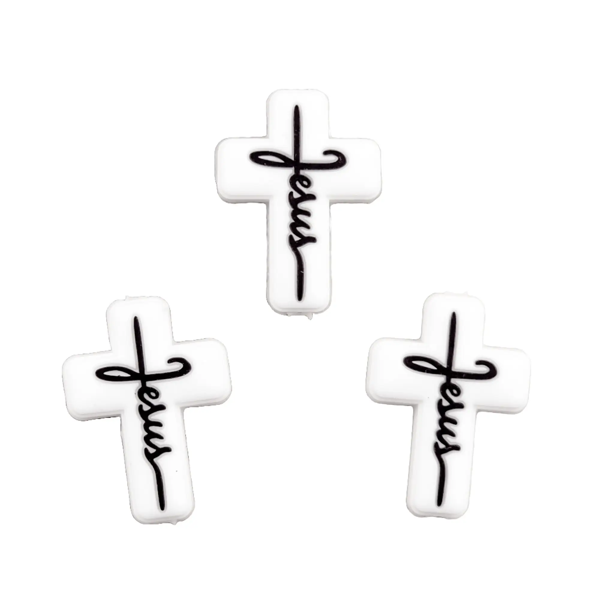 Home » Groothandel in Siliconen Kralen – Zakelijk en Particulier » Siliconen kraal – Wit Kruis – met tekst Jezus